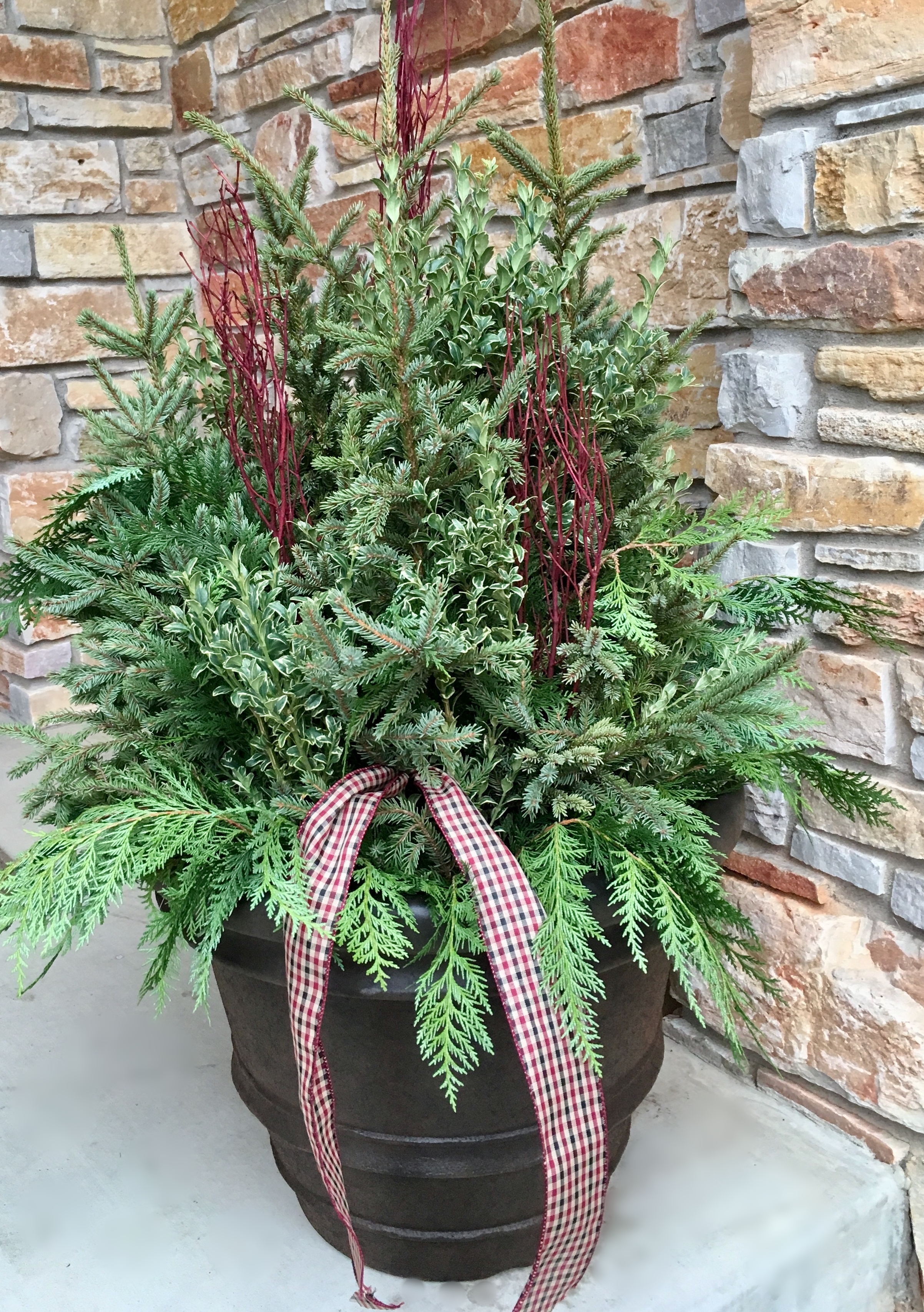 I can almost smell the evergreens! I love, love, love it! This traditional lady is jam-packed with spruce tips, oregonia, cedar and jaybanches, and plain old happiness. This lady makes me so happy when i’m driving up to my home. When everything else has lost it’s battle with the snow and bitter cold. There she is, waiting to put a smile on my face. Happy Holidays!