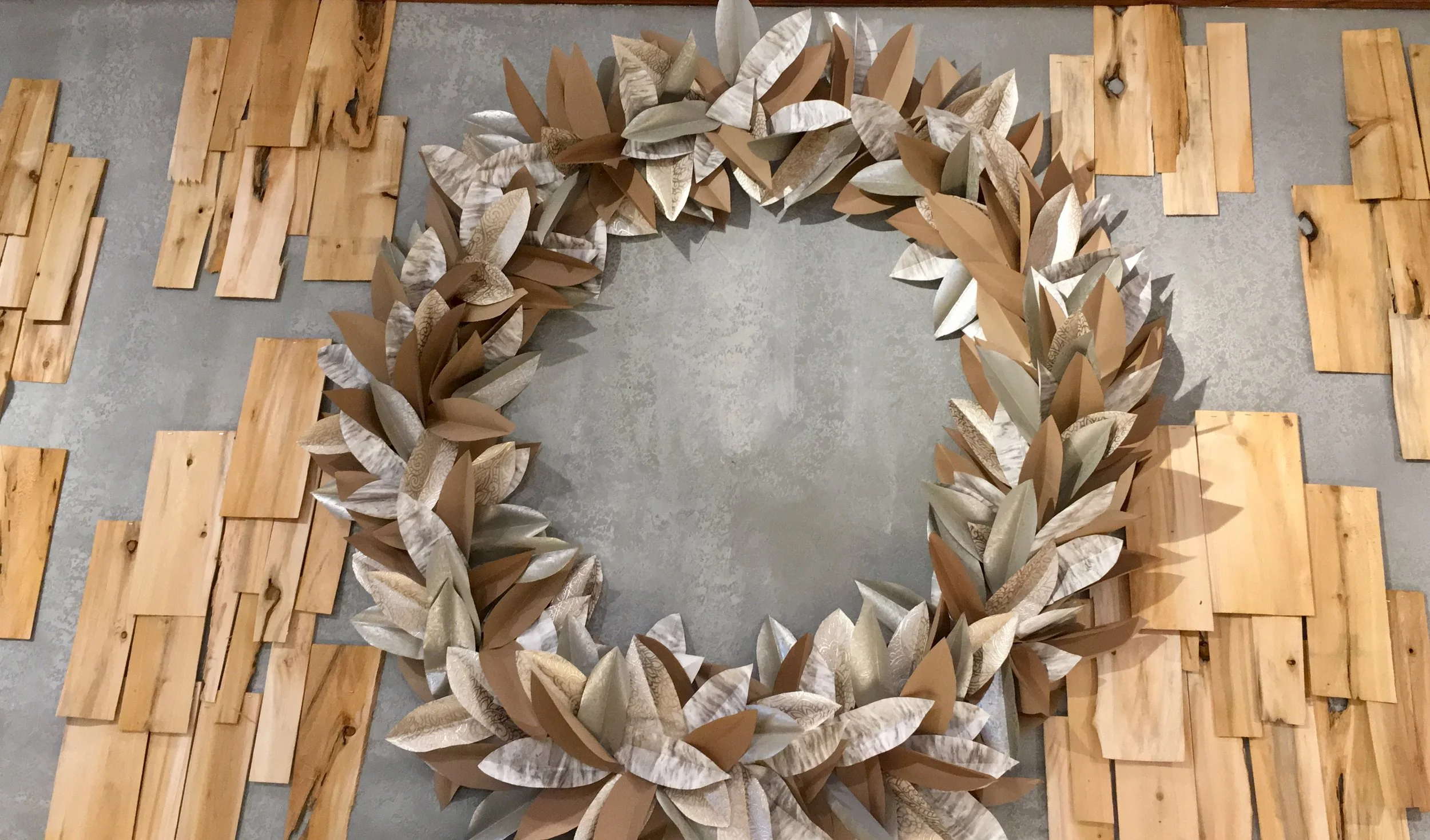 A Pool noodle base?? What?? Tell me how??? First, gather 9 pool noodles at the dollar store. Use duct tape to tape them together, 2 on the bottom and 1 on the top of the two. Do this in sections of three, then tape the 3 sections together. This creates your wreath base. Now, get some killer wallpaper (magnolia Perhaps???) grab 2 or 3 kinds the go together. This will help create dimension and interest. In this wreath, I sprinkled in some craft paper. Now, cut about 200 leaves and make a crease in all the them. Once you’re done cutting and creasing, attach the leaves with hot glue at the end of the leaf and pressing it against the pool noodle. Remember, to cover the noodle completely. This is so EASY! You can go crazy, add berries, lights, or moss. The only limit is your imagination! Ready set GO!